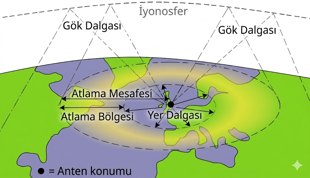 Kısa bir bilgi olarak HF frekanslarda İyonosfer tabakaları gelen radyo sinyalini yansıtarak daha uzağa gitmesini sağlar.